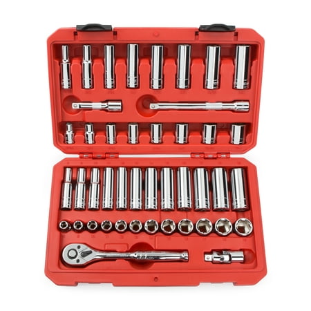 Comprehensive and complete the TEKTON 45-pc. 3/8 inch Drive Socket Set is a master 3/8-inch drive set with every size from 5/16 to 3/4 inch and 8 to 19 mm in both deep and standard lengths. It also includes a universal joint and 6-inch extension which are rarely found in other sets. Each socket has a high-torque 6-point design that grips flat sides of fasteners not corners preventing round-off. Needing just 5 degrees of swing to operate the smooth finely geared 72-tooth ratchet isn t limited by tight spaces. For superior performance all tools are made from premium chrome vanadium steel and protected by a mirror chrome plated finish. The tough and compact storage case keeps everything organized and saves space in your toolbox.