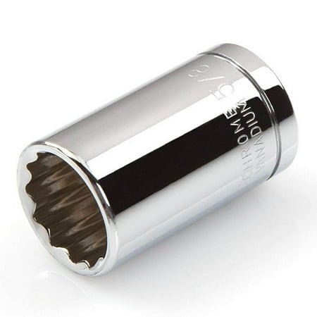 TEKTON 14215 1/2 Drive x 5/8 Shallow Socket Designed to apply maximum torque the 12-point opening of the TEKTON 14215 1/2 Drive x 5/8 Shallow Socket snugly fits the hex shape of fastener heads so there s no opportunity for slipping. To prevent round off it grips the flat sides of fasteners rather than the corners. With a shallow well and slim walls this socket has the clearance to fit into tight narrow spaces. Detent notches inside the drive end securely lock socket onto ratchets and extensions so it won t fall off or stick on fasteners. Made from premium chrome vanadium steel it s protected from rust and corrosion by a durable mirror chrome plated finish. Features 12-point opening smoothly slides onto hex-shaped fastener heads at twice as many angle positions as 6-point sockets • Advanced design grips flat sides of fastener heads not corners to prevent round off • Shallow well and slim walls allow socket to fit into tight narrow spaces • Detent notches in drive end lock onto ratchets and extensions • Made from premium chrome vanadium steel with a durable mirror chrome plated finish