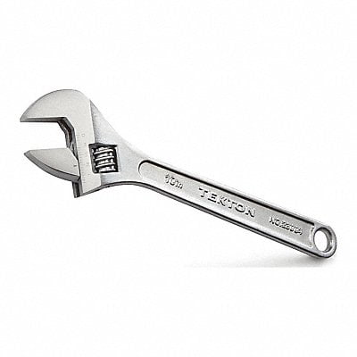 Designed for heavy-duty applications the TEKTON 10 in. Adjustable Wrench can take on automotive and small farm equipment repair. It also works well to secure back nut or bolt while tightening or loosening front nut or bolt with a socket or combination wrench. TEKTON adjustable wrenches are designed to be versatile enough to tighten and loosen fasteners of various sizes without needing to grab other tools. Made from durable carbon steel with a corrosion-resistant satin chrome finish our wrenches will become a permanent staple in your toolbox. Manufactured to strict quality specifications TEKTON adjustable wrenches meet or exceed ANSI performance standards. Precision-machined for a tight fit the slide jaw and worm gear contact in 3 spots for smooth operation and less play. Knurling on worm guide allows for quick jaw size adjustment. The satin finish keeps wrench looking like new by hiding scratch marks that can be seen in regular chrome finished wrenches. Jaw opening guide has permanent laser etched size markings in both metric and Inch scales. The dual Inch/metric scale is useful measuring the size of nuts and bolts. Each wrench displays a stamped length size and model number for distinction among your TEKTON adjustable wrenches.