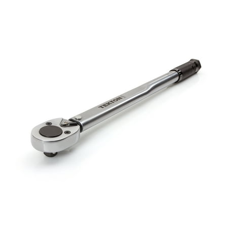 Calibrated to an accuracy of +/- 4% the TEKTON 1/2 in. Drive Click Torque Wrench lets you work with confidence eliminating guessing and the common tendency to overtighten fasteners. Correctly tightening fasteners to a vehicle or equipment manufacturer s torque specifications ensures parts are properly secured without being damaged. Simple and easy to use this wrench has a reversible ratcheting head that drives fasteners in both directions and measures torque in the clockwise direction. To measure torque set the desired value on the handle scale (foot pounds or Newton meters) and begin tightening the fastener. When the pre-set torque value is reached a reliable mechanical operation inside the handle produces a click you can hear and feel alerting you to stop applying force. Built for consistent performance and years of dependable service the mechanical design doesn t need batteries and the all-steel construction has no plastic parts to break or wear out.