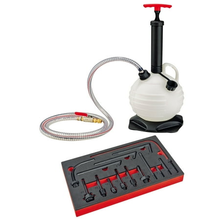Save time and messy cleanups with the Powerbuilt ATF fluid filler kit! It works on many vehicle makes and models with a generous 6-liter reservoir and 14 vehicle-specific adapters. Simply add ATF fluid to the reservoir attach the appropriate adapter to the hose fitting give the pump handle a few pumps insert the adapter in the ATF fill tube then open the fluid line using the built-in cut-off valve handle. It s fast simple and clean! The heavy-duty reservoir tank stays stable during pumping and use thanks to the built-in base plate. It has molded fill-level indicators for precise fluid transfer while the heavy-duty 6 1/2 foot long 5/8 inch OD fill tube is reinforced for flexibility and durability without kinking. The final touch is the included EVA foam storage tray for the adapters that fit right in your toolbox drawer for safe storage and easy access!