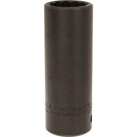 When you take advantage of this impact socket from Proto you ll have all the rails bits and bars for your own projects. Constructed of alloy steel this impact socket has 1/2 drive size and is 3-1/4 in length. Features of this impact socket include: ideal for use on stubborn or damaged fasteners Features Drive Type: square Category Type: Impact Socket Impact Rated: Yes Output Type: 12 pt. Standards: AS954E S3.8.1 ASME B107.2 Size: 13/16 Item: Impact Socket SAE or Metric: SAE Socket Depth: Deep Drive Size: 1/2 Number of Points: 12 Finish: black oxide Overall Length: 3-1/4 Features: Ideal for Use on Stubborn or Damaged Fasteners and on Fasteners Made from Soft Materials; TorquePlus(TM) Design Allows for Quick and Easy Socket Engagement to Fastener Flats (not corners); Radius-Corner Design Shifts Contact Area and Stress Away from Fastener Corners Minimizing Slippage; Extended Fastener Life; Ease of Turning Worn Rounded or Rusted Fasteners; Size Stamped on Tool for Easy Identification; Side Locking Hole for Securing Socket to Tool Material: Alloy steel