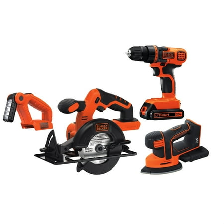 BLACK+DECKER BD4KITCDCMSL 20V MAX* Lithium Ion 4-Tool Combo Kit: features a Drill/Driver Circular Saw MOUSE Detail Sander Light. This 4-tool kit provides value to weekend warriors experienced craftsman and DIYers alike. Experience the convenience of cordless with the 20V MAX* Lithium Ion power. The LDX120 drill/driver is compact and lightweight with LED light to illuminate your project surface – an 11 position chuck to prevent stripping of screws with a keyless chuck for easy bit changes. The BDCCS20 Circular Saw features a 5.5 fast cutting blade bevel adjustment with detents at 45 and 90 degrees for angle cuts and tool-free depth of cut for easy adjustment. The BDCMS20 MOUSE Sander operates at 12000 OPM for quick material removal. A detail finger attachment allows access to tough to reach spots with multiple grip positions for added comfort – and a dust collection bag. The BDCF20 LED Work Light features a pivoting head to illuminate tough to reach spaces . *Part of the 20V MAX* Lithium Ion battery system. Kit contains: 1) LDX120 Drill/Driver 1) BDCCS20 Circular Saw 1) BDCMS20 MOUSE Detail Sander 1) BDCF20 LED Work Light 2) LBRX20 20V MAX* Battery 1) Battery Charger 1) Double ended driver bit 1) 5.5 Circular saw blade 1) Circular Saw wrench 3) sheets sand paper.