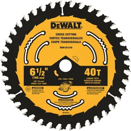 DeWalt DWA161240 Circular Saw Blade 6-1/2 In Dia 5/8 In Arbor 40-Teeth. DEWALT Saw Blades are ideal for any wood-cutting application. The exclusive patent-pending ToughTrack tooth design on our framing & ripping blades is engineered to deliver straight accurate cuts over the life of the blade. Patented Body Slots reduce vibration which works with the blade s thin kerf design to deliver exceptional user feel. High-Density Tungsten Carbide teeth are tough wear-resistant and provide long life. The reinforced shoulder is designed for strength & durability by providing impact resistance especially in nail-embedded wood. These blades come with ToughCoat anti-stick coating to reduce friction and gumming. Optimized for use on both corded and cordless circular saws.
