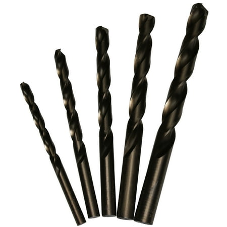Heavy Duty 135 Split Point Cobalt Steel Jobber Length manufactured to National Aerospace standard 907. These drill bits display high red hardness permitting speeds up to 30% greater than with conventional M2 high speed steel and are especially effective in drilling tough high tensile strength materials like stainless steel inconel and titanium. The 135 split point is self-centering and reduces thrust. and Drill set comes in a plastic pouch case. Set includes 5 drill bits from 1/4 to 1/2 Sizes in the set include: 1/4 5/16 3/8 7/16 and 1/2